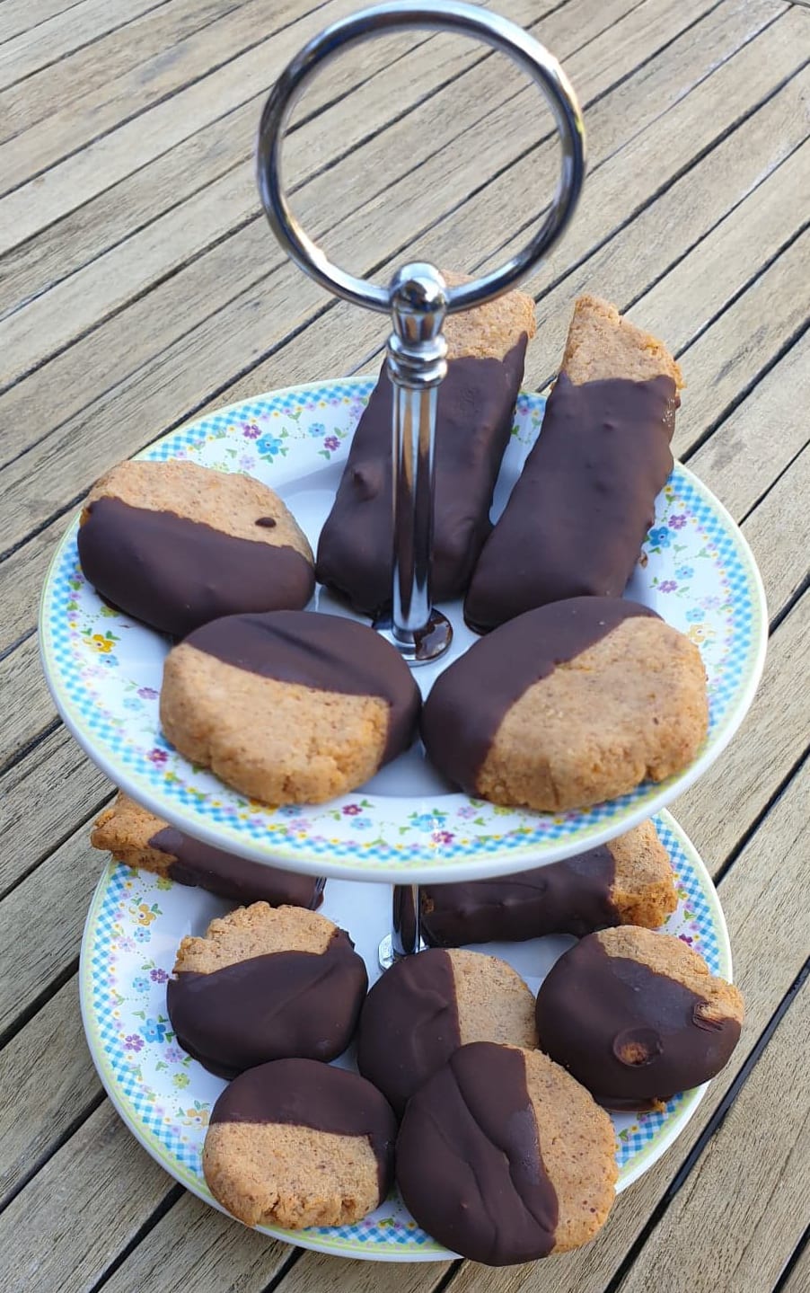 OPTIE 2: Je kunt de koekjes bedekken met een chocoladelaagje (zie foto rechts). Het is belangrijk dat je voor je dit gaat doen, je de koekjes of reepjes eerst goed laat bevriezen!
